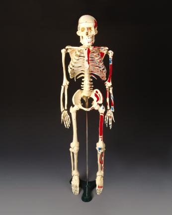 LFA # 2229. This new 33 1/2" budget painted skeleton has muscle insertions and origins painted on the left side of the skeleton and numbers of important features on the right side. Calvarium is cut with moveable jaw mounted on springs. Arms, legs and skull are removable. Stand and keycard included.