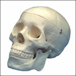 This economical, life-size adult plastic skull is ideal for students studying for tests. It clearly shows suture lines, and features a movable jaw, cut calvarium and 3 removable lower teeth - incisor, cuspid and molar. Dissects into 3 parts. Size: 5"w x 8-1/2"h x 6"d. Weight: 5 lbs.