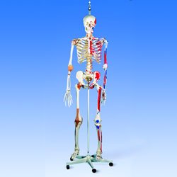 This top-of-the-line version contains all the benefits you have come to expect in our high-quality 3B Scientific standard skeletons. "Sam" the super skeleton additionally allows you to demonstrate the movements of the skull and head joints as well as all natural human postures due to the fully flexible vertebral column. The unique combination of flexible vertebral column, muscle origins and insertions, numbered bones, flexible joint ligaments and a disc prolapse between the 3rd and 4th lumbar vertebrae display over 600 structures of medical/anatomical interest in this top human skeletal model. Perfect for in depth study of the human skeleton and more. Manual final assembly. Made of durable, unbreakable plastic. Almost realistic weight of the approx 200 bones. Life-size, 3-part mounted skull Individually inserted teeth. Stand and dust cover included. Can also be used with a wall mounted A59/8 (not included) multifunctional stand for a space saving solution. In addition to these features the relationship between the muscle system and skeletal system is easily displayed with the muscle origins and insertions hand painted on the skeleton. This muscle skeleton is a great addition to any anatomy or biology classroom.