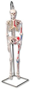 3B Scientific A18/6 Mini Human Skeleton Shorty, on Hanging Stand with Painted Muscles, 37" Height Description:Mini human skeleton - shorty - with painted muscles, on hanging stand. "Shorty" is a top of the range mini human skeleton with the detail of hand painted muscles. Skillful 3B Scientific engineers using powerful hardware and software optimized the process of reproducing miniatures in order to keep all anatomical details and structures even at half natural size (80 cm). The skull can be removed and disassembled into three parts (skullcap, base of skull, mandible). The arms and legs are removable for easy study of the mini skeleton with painted muscles. The hip joints are specially mounted so their natural rotation can be demonstrated. The portrayal of the muscle origins (red) and insertions (blue) on the left half adds to the anatomical value of the skeleton. The muscles are numbered. The mini skeleton comes on a hanging stand that can be placed on the floor or mounted on the wall since it can be taken off of its base.
